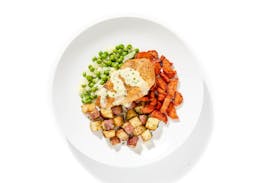 This meal was great. The moist chicken was sitting in a bed of delicious peas, onions and a creamy sauce.The accompanying carrots and potatoes were also very tasty.