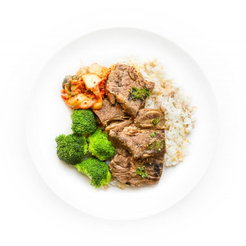 Thin-cut, bone-in beef short ribs are marinated in sweet and savory Korean BBQ sauce and grilled for a hint of smoke. Tender broccoli, tangy Napa cabbage kimchi and fluffy white rice complete this delectable dish.