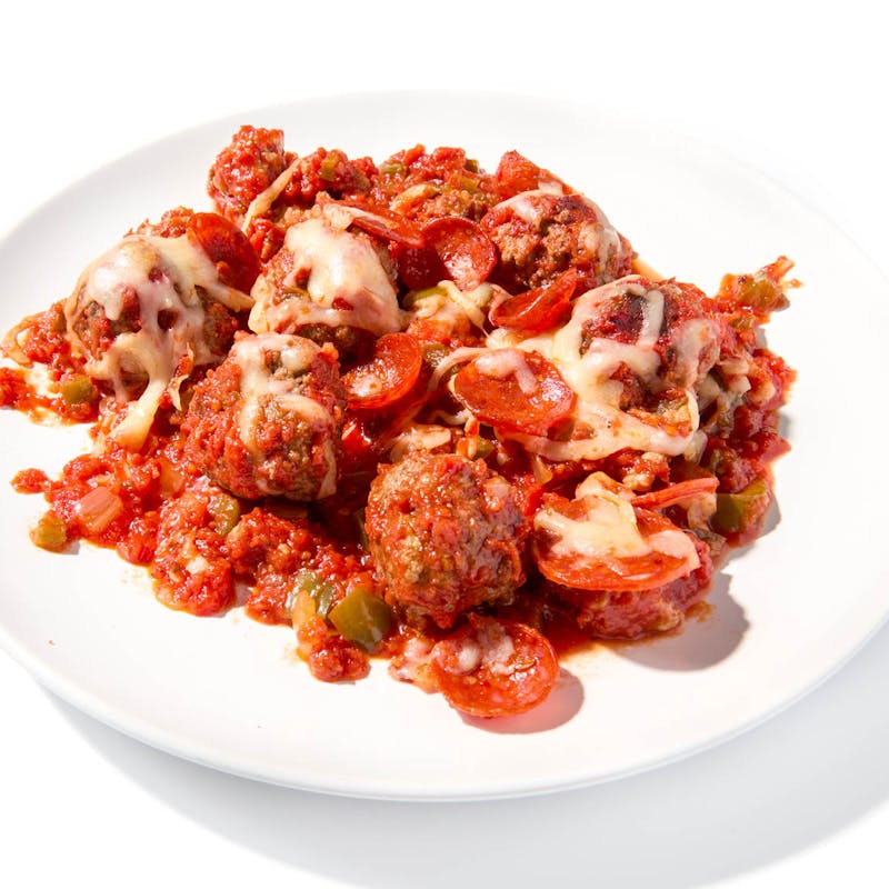 Where to start with this ultimate comfort meal? The savory beef meatballs, of course! They’re handmade, seasoned with garlic, onion, and Italian herbs, and browned to juicy perfection. Chef Tracey bakes them in rich, tangy marinara sauce with onions and green peppers and tops them with sliced pepperoni and Mozzarella cheese for next-level flavor and ooey-gooey goodness. A fresh green salad or some crusty bread (or both!) make perfect partners for this indulgent treat that combines everything you love about hearty, home-style Italian cooking.