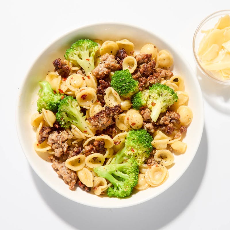 Parmesan Cheese, Canola and Olive Oil Blend, Butter, Broccoli , Black Pepper, Garlic, Kosher Salt, Orecchiette, Ground Italian Sausage, Crushed Red Pepper, Canola Oil