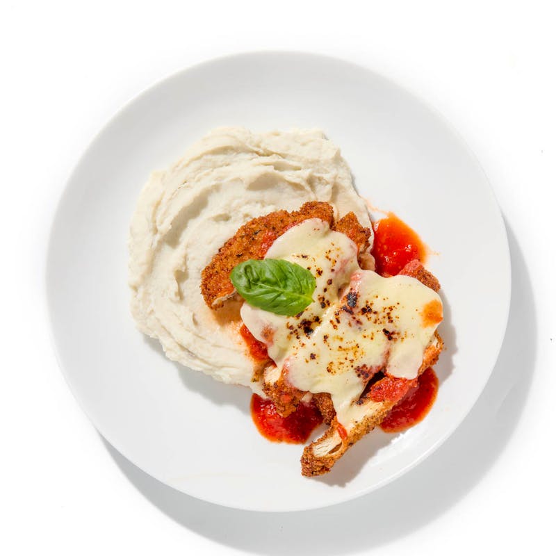 Golden chicken cutlets meet a rich tomato-basil sauce and melty mozzarella in Chef Kenny’s crowd-favorite riff on parm. Instead of pasta, this version leans into creamy, parmesan-laced mashed potatoes—warm, cozy, and satisfying.