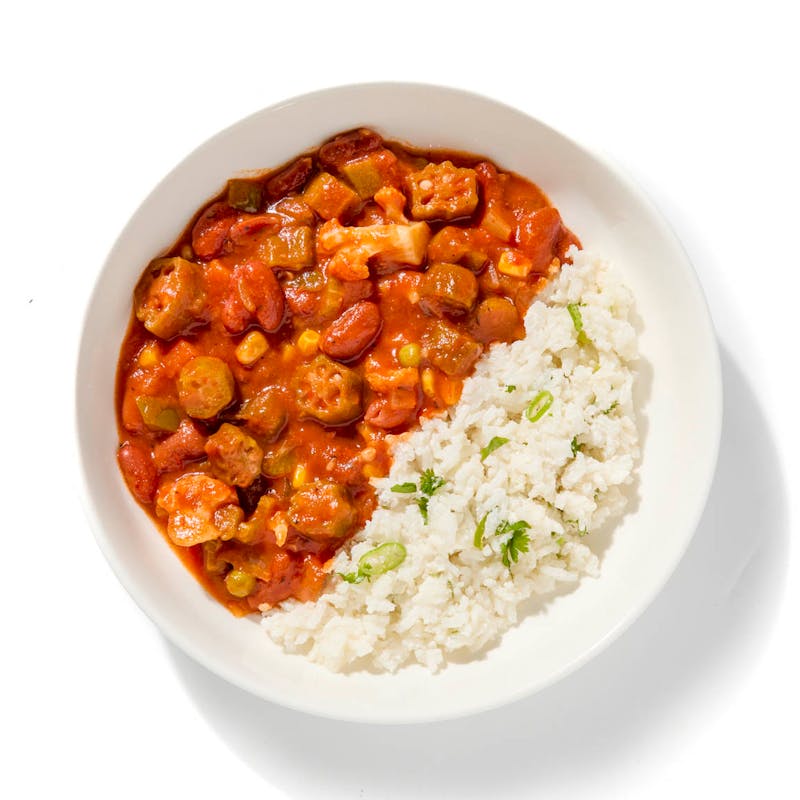 Canned Tomato, Coconut Milk, Jasmine Rice, Cauliflower, Okra, Red Kidney Beans, Crimini Mushroom, Green Peas, Carrots, Corn, Extra Virgin Olive Oil, Green Bell Pepper, Onion, Celery, All Purpose Flour, Green Onion, Lime Juice, Coconut Oil, Vegetable Base, Cajun Spice, Tomato Paste, Cilantro, Garlic, Black Pepper, Kosher Salt, Thyme, Bay Leaf, Nutmeg