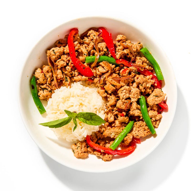 A nourishing and punchy Thai favorite. Here, ground chicken is stir-fried in an aromatic mix of garlic, chili, and Thai basil, alongside snappy green beans and red bell peppers. Combined with a sweet, spicy, and savory sauce that’s packed with more basil, it’s served over soft jasmine rice to soak up the flavor.