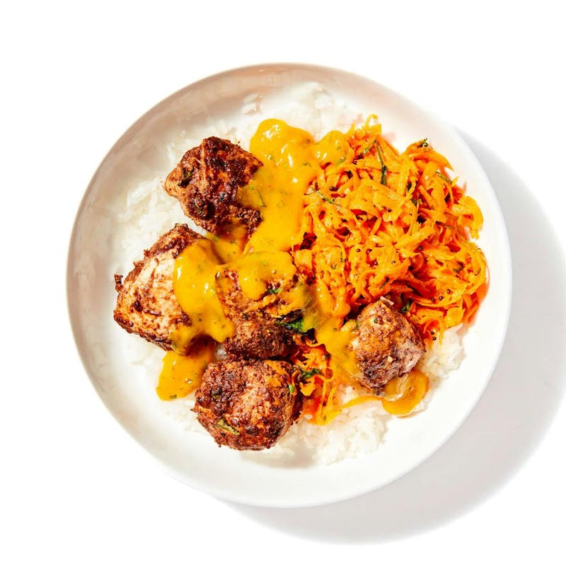 What makes these chicken thighs so delicious and addictive? Chef Aarthi's Sri Lankan-inspired marinade, with hints of aromatic spices like cardamom, cumin, and coriander. Served with a sweet and tangy mango chutney, jasmine rice, and a shredded carrot salad, it hits all the flavor notes you could ever want in a dish.
