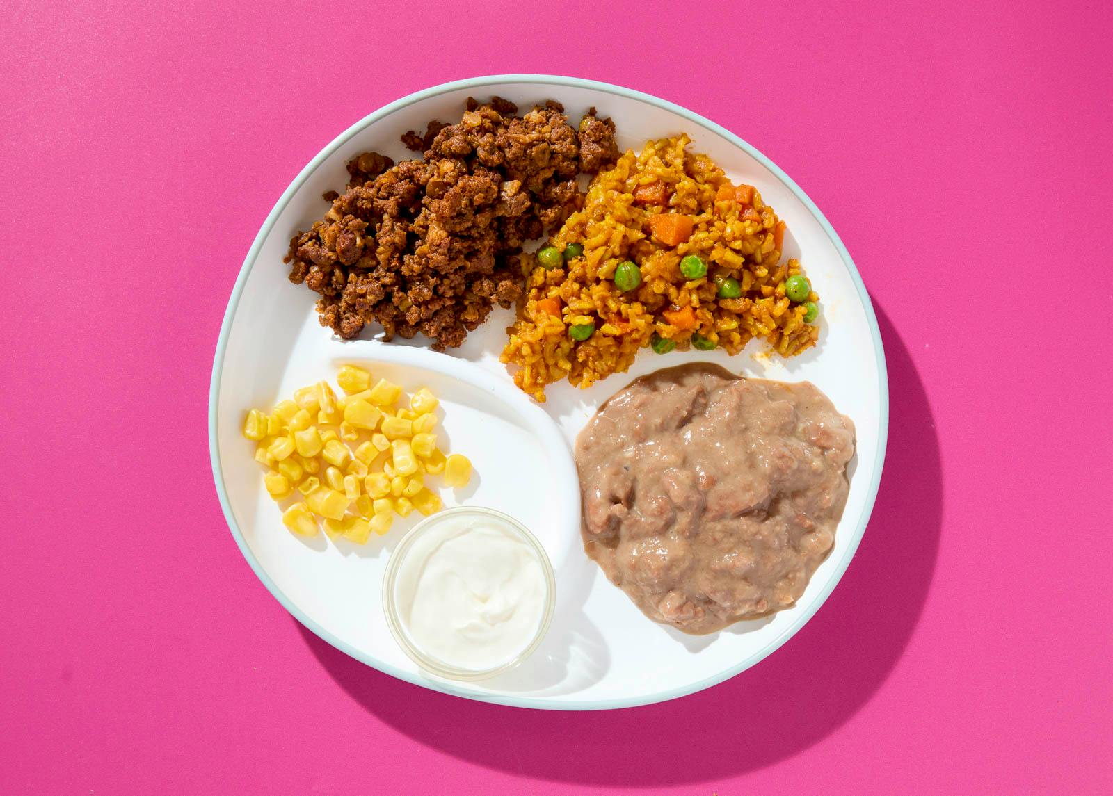 A kid-friendly take on taco night, this colorful plate features a beef-and-lentil smash sautéed with cauliflower, tomato paste, and classic taco spices. It’s served with refried pinto beans, turmeric-spiced Mexican rice with peas and carrots, corn kernels, and a side of sour cream for dipping.