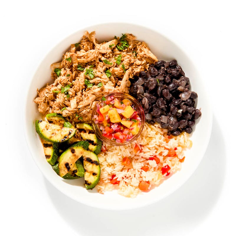 The star of the bowl is the juicy, shredded chicken, seasoned with a blend of spices like cumin, chili powder, and garlic, then simmered until it’s melt-in-your-mouth succulent, with edges from a quick sear. On the side are grilled zucchini with black beans, and a bright mango salsa with jalapeño for a subtle kick.
