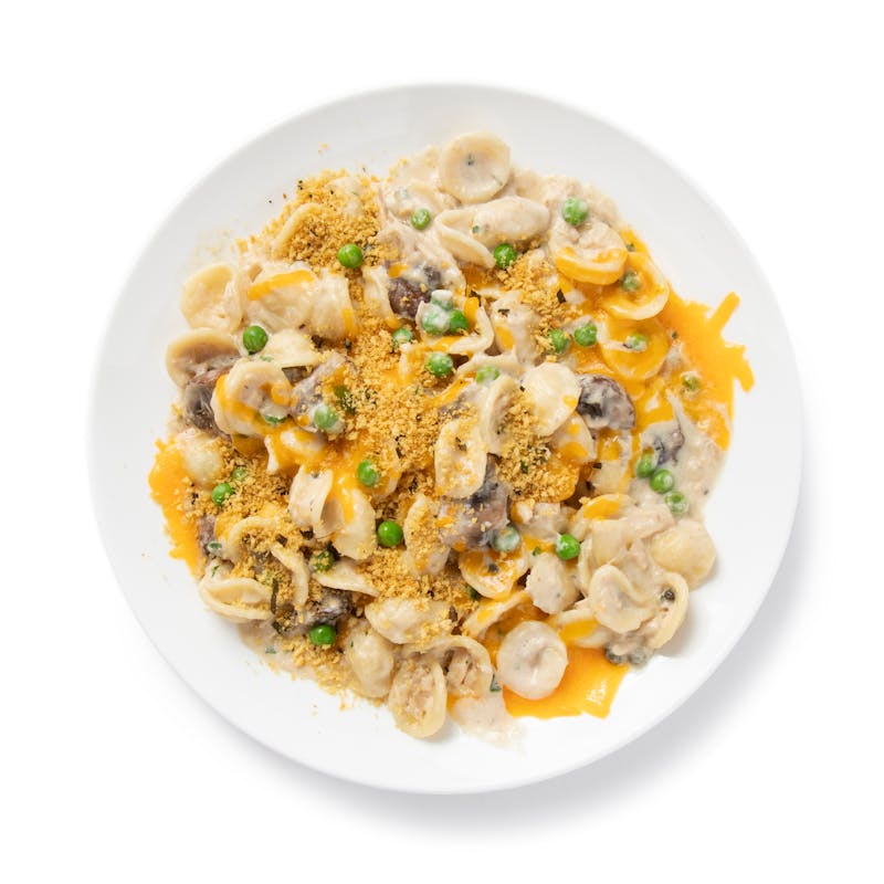 Oh man, what's more comforting and delicious than old school tuna noodle casserole? Tuna and cavatappi pasta are tossed in a creamy, homemade mushroom gravy that's complimented by fresh sweet peas and a crunchy, cheesy herbed breadcrumb topping. This is Chef Chris' grandma's recipe, and you'll savor every last bite of it.