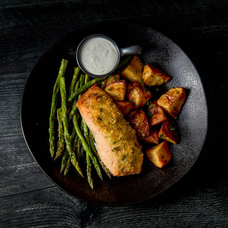 Chef Meena whips up a perfectly baked salmon fillet seasoned with garlic, herbs, and Parmesan, then served with a side of crispy lemon roasted potatoes and asparagus. Enjoy it with a drizzle of lemon dill sauce.