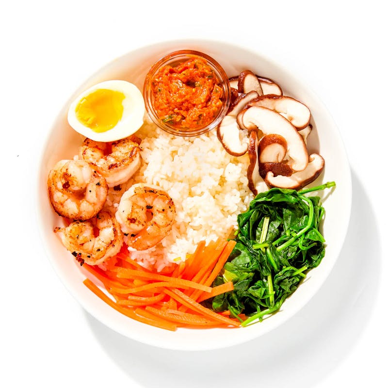 Sesame Oil, Butter, Carrots, Spinach, Toasted Sesame Oil, Shiitake Mushrooms, Shrimp, Black Pepper, Garlic, Honey, Egg, Sugar, Light Soy Sauce, Jasmine Rice, Kosher Salt, Grapeseed Oil, Rice Wine Vinegar, Green Onion, Ginger, Rice Wine, Gochujang Sauce, Toasted Sesame Seeds, Soy Sauce