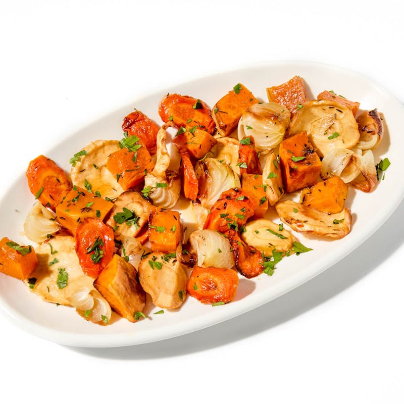 Dive into an elegant, fall-inspired root vegetable side dish that’s guaranteed to take center stage at your Thanksgiving or Friendsgiving feast. Delicata squash, parsnips, carrots, and Cippolini onions all get roasted with maple syrup, and thyme until sweet, tender, and beautifully golden brown. A shower of fresh Italian parsley provides the perfect finishing touch.