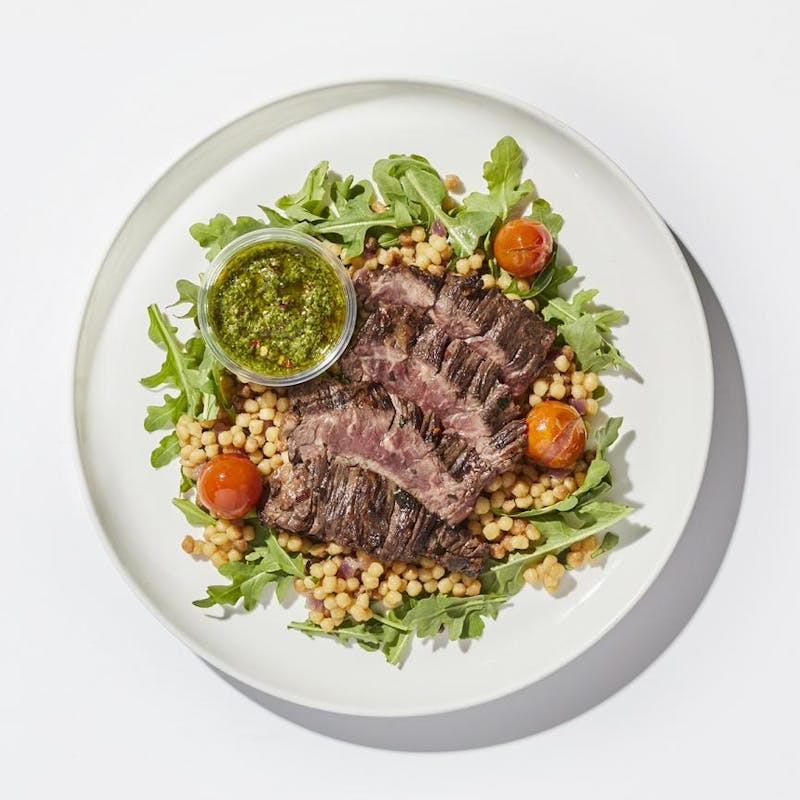 Cherry Tomato, Fresno Peppers, Canola and Olive Oil Blend, Extra Virgin Olive Oil, Red Onion, Red Wine Vinegar, Black Pepper, Cilantro, Garlic, Fregola Pasta, Oregano, Kosher Salt, Balsamic Vinegar, Thyme, Crushed Red Pepper, Basil, Arugula, Italian Parsley, Skirt Steak