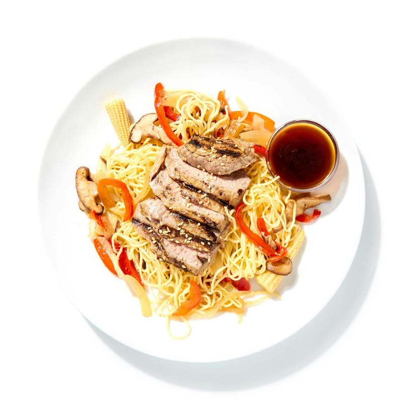 Fresh, flavorful, and fast—Chef Esther’s take on this Chinese take-out favorite stars with thick wonton noodles and lots of veggies, including baby corn, shiitake mushrooms, onions, and sweet bell pepper, all stir-fried with rich, super-savory soy and sesame sauce until perfectly tender. (There’s extra sauce on the side, too, so you can tailor the meal to your taste.) And speaking of tender… she tops that tantalizing combination with a hearty portion of sliced flank steak, grilled for deliciously smoky char. Meet your new go-to meal.
