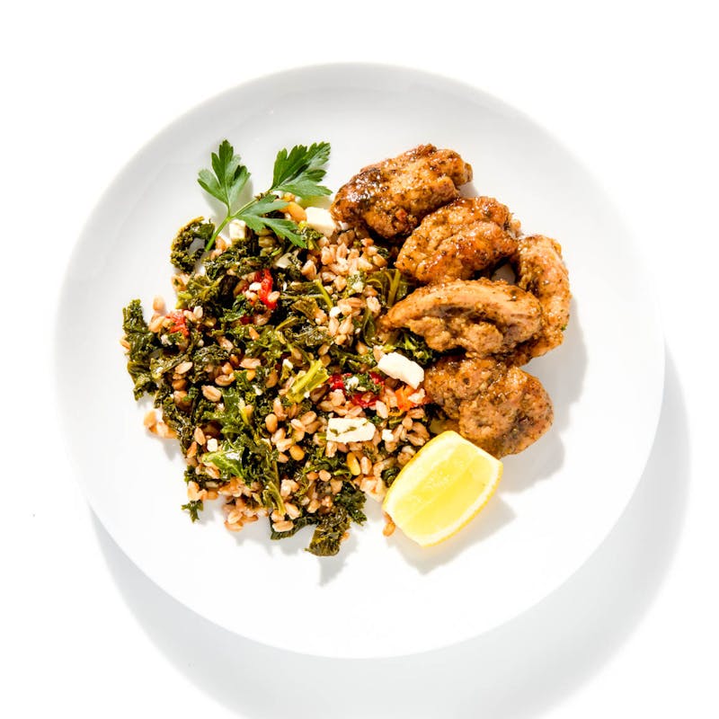 Chef Akhtar channels a bit of Mediterranean sunshine with this light, bright, and nourishing dish. Chicken thighs are marinated in a tangy-sweet mix of honey, vinegar, butter, and garlic, then seared until golden and braised until the sauce turns glossy. They’re served next to a bed of nutty farro, folded with braised kale, briny feta, sun-dried tomatoes, toasted pine nuts, and a splash of olive oil.