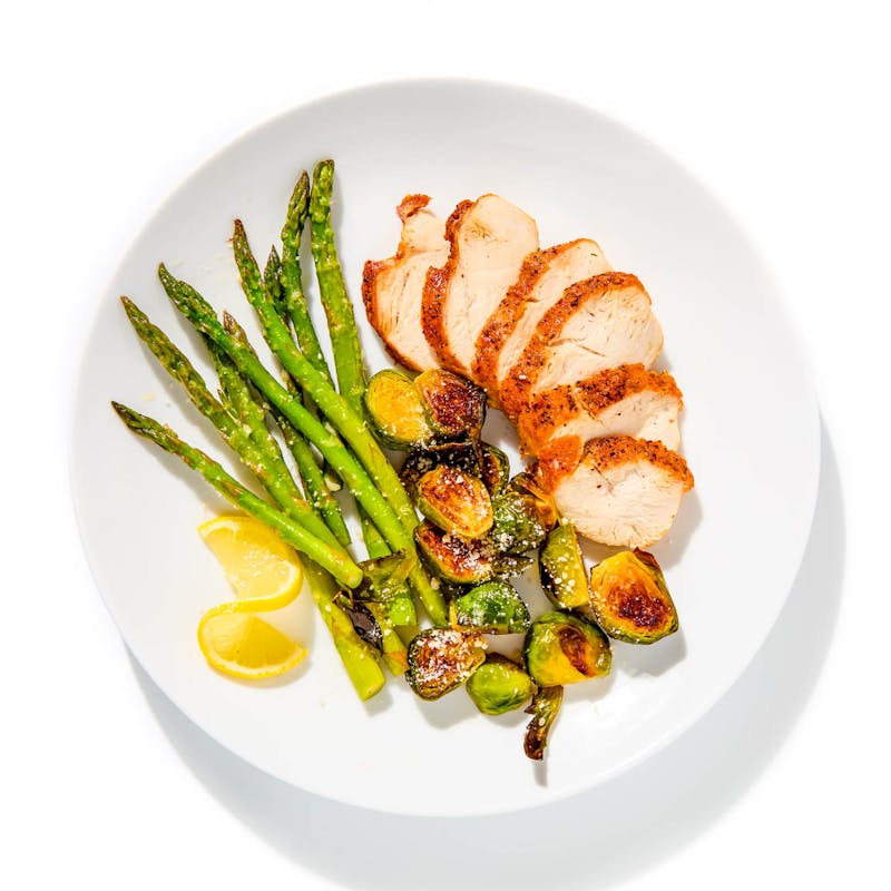 A well-balanced meal that’s light, bright, and filling. Here, chicken breast is baked until tender in a zesty marinade, then served with a nourishing side of roasted asparagus and caramelized Brussels sprouts. It’s finished with a squeeze of fresh lemon for an extra burst of citrusy freshness.