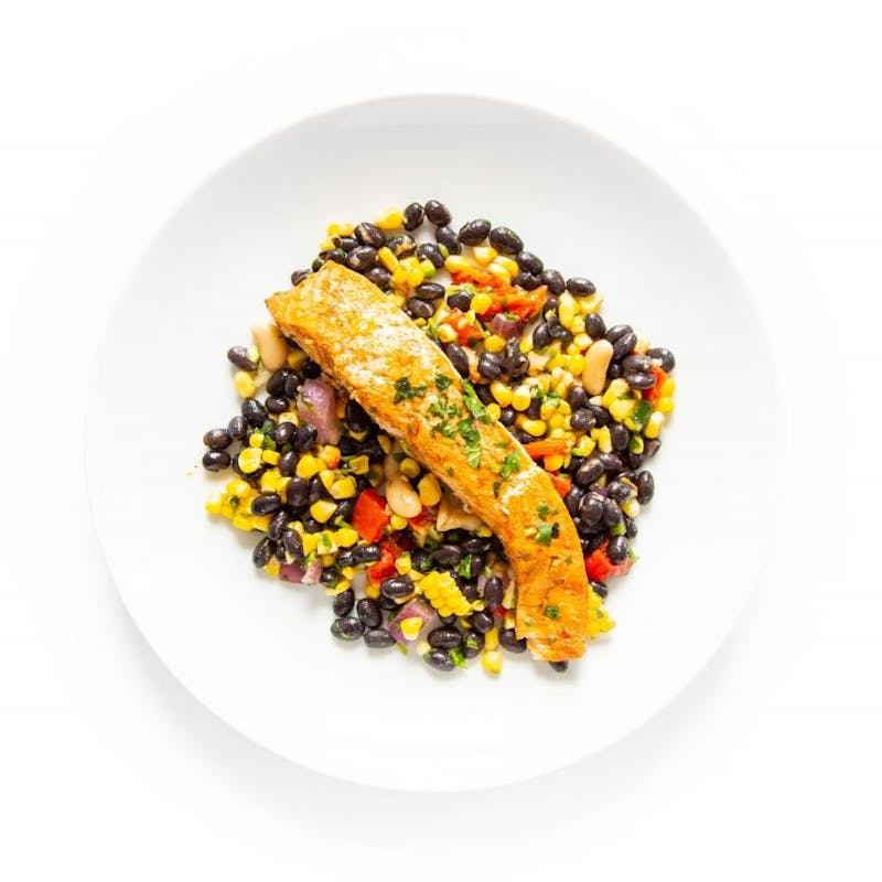 Brown Sugar, Canned Black Beans, Red Onion, Cumin, Black Pepper, Corn, Cilantro, Chili Powder, Honey, Kosher Salt, Jicama, Cider Vinegar, Apple Cider Vinegar, Lime Juice, Salmon, Red Bell Pepper, Canola Oil, Paprika