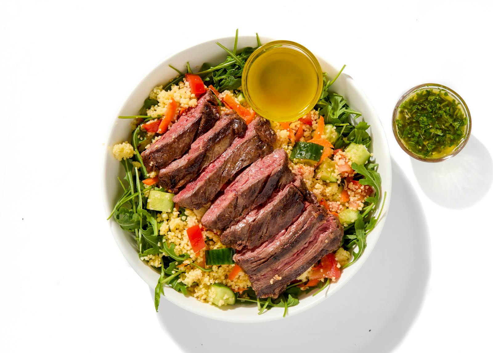 Marinated skirt steak, grilled and sliced, comes served over a bright couscous salad of cucumber, tomato, and arugula. Herby chimichurri on the side adds a fresh, garlicky punch.