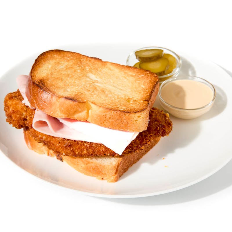 Crispy chicken schnitzel and smoky ham are stacked between toasted pan de mie, and a layer of sharp Dijon mustard to cut through the richness, with tangy pickles on the side and a velvety Mornay sauce for dipping. This sandwich delivers all the flavor, texture, and cheesy comfort of classic cordon bleu—no knife and fork required.