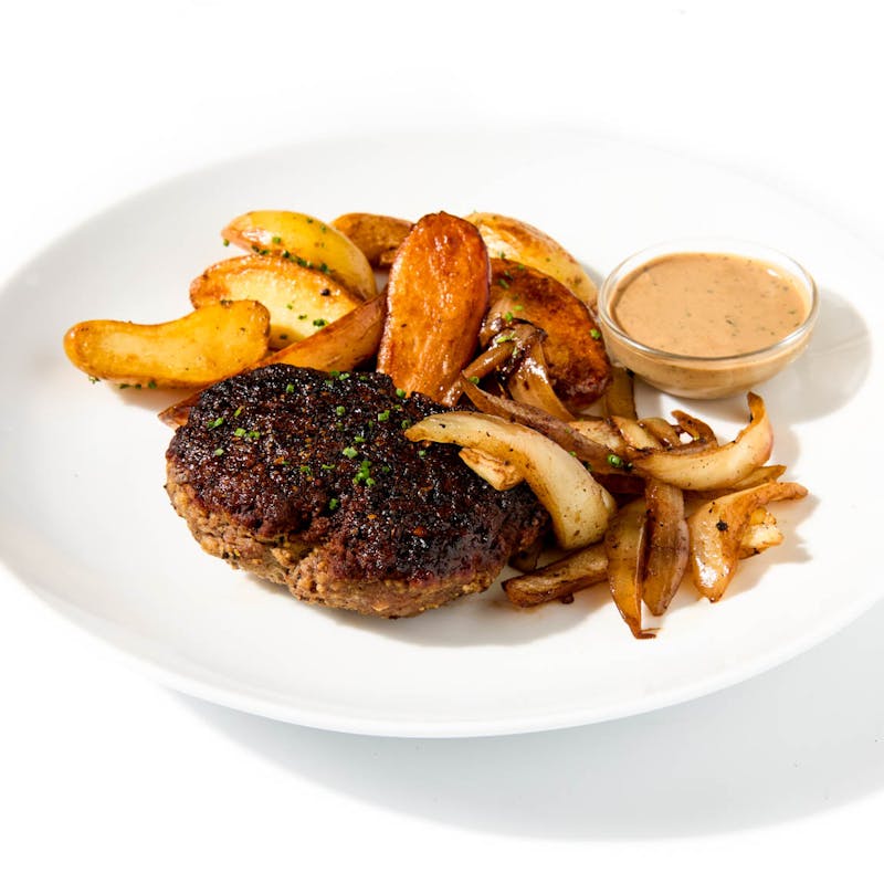 This elevated yet comforting dish from Chef Kevin features a juicy beef patty, laced with black pepper and Dijon mustard, seared to a bronzed crust. It’s paired with a creamy sauce studded with brined green peppercorns—a nod to the classic steak au poivre. Golden-roasted potatoes and charred onions are served on the side, with a flurry of fresh chives to finish.