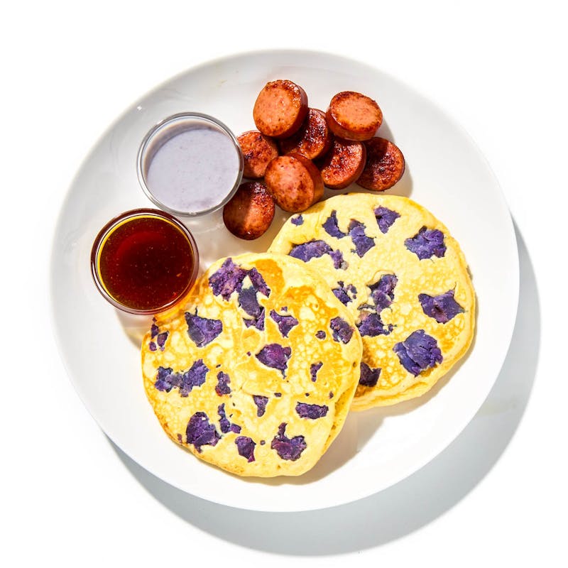 A bento built for breakfast lovers. Here, Okinawa sweet potatoes are whipped into fluffy pancakes, then paired with smoky kielbasa sausage for a savory punch. A velvety sweet potato coconut syrup, made with Okinawa puree, condensed milk, and coconut is served alongside for a buttery finish.