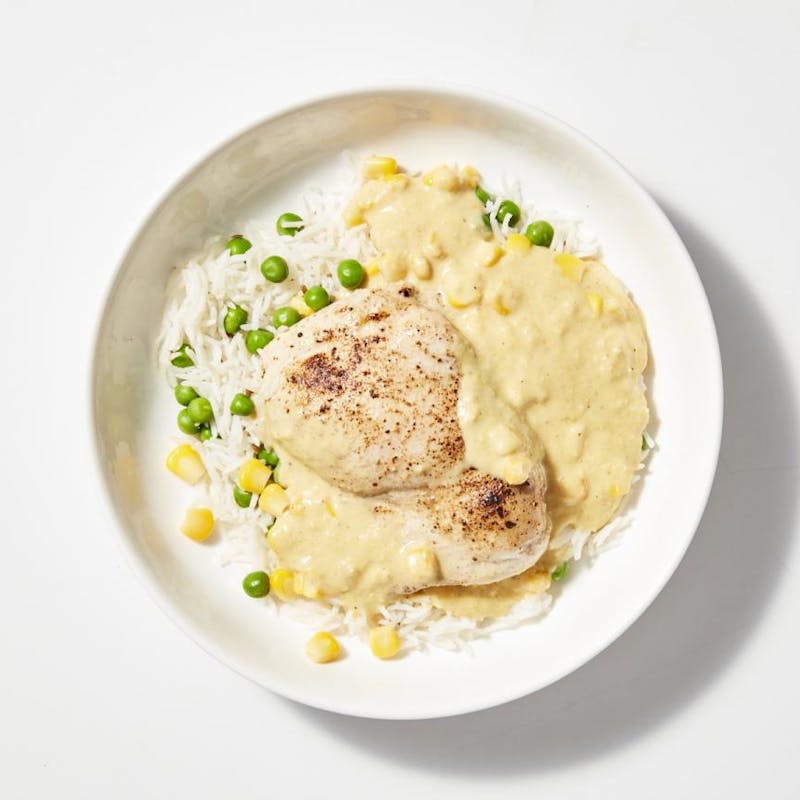 Nutmeg, Chicken Thigh, Coriander Seeds, Turmeric, Butter, Canned Corn, Cumin, Avocado Oil, Garlic Powder, Garlic, Sour Cream, Sugar, Heavy Cream, Onion, Basmati Rice, Peas, Kosher Salt, Espelette Pepper , Lime Juice, Ginger, Ginger Powder, Spice, Cardamom, Green, Whole