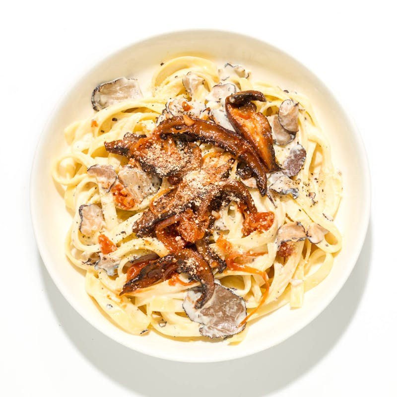 Vegan Parmesan, Vegan Heavy Cream, Truffle Seasoning, Fettuccini, Black Pepper, Gum, Xanthan, Garlic, Portabello Mushrooms, Kosher Salt, Grapeseed Oil, Crimini Mushroom, Black Truffle Oil