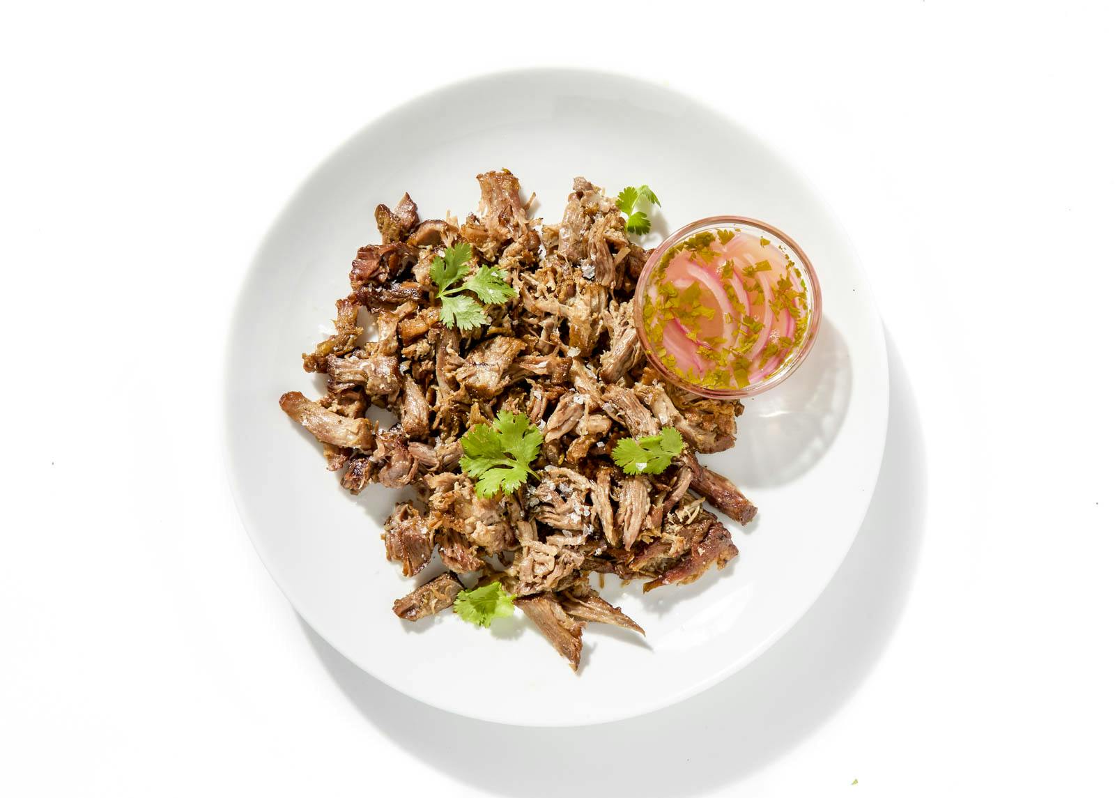 Lechon, or Cuban pork, is heavily marinated with herbs, lime, and delicate spices. The pork is cooked over low heat until its fork tender. The mojo de ajo sauce is a staple of Cuban cooking and is bright and flavorful with onions, cilantro, cumin, and lots of lime. Chef Michelle serves her lechon with white rice, black beans (frijoles), and sweet plantains for a perfect balance of flavors and textures.