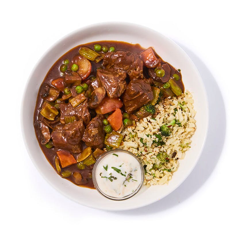 This delicious dish is rich and filling, despite being low in carbs. It's packed with all the comforting flavors you think of when you talk about beef stew with unmatched, slow-cooked flavor. Accompanied by a hearty bulgur salad made with broccoli and cauliflower, a side of tzatziki provides the perfect balance of cooling creaminess to the dish.