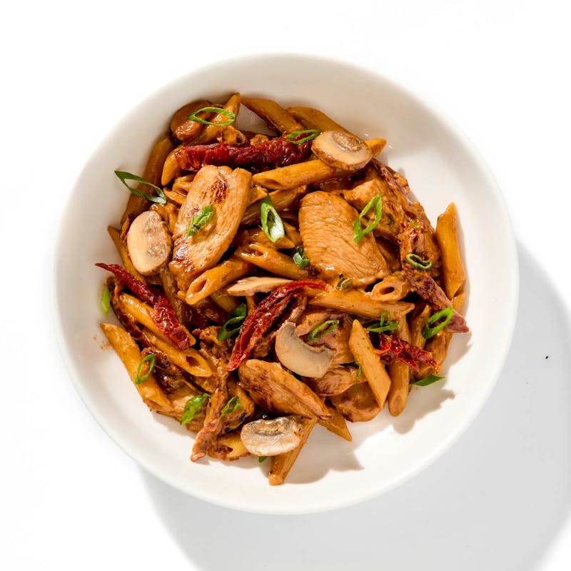 Heavy Cream, Chicken Thigh, Penne, Crimini Mushroom, Canola and Olive Oil Blend, Sun Dried Tomatoes, Garlic, Butter, Chicken Base, Green Onion, Kosher Salt, Jerk Sauce, Sauce, Teriyaki