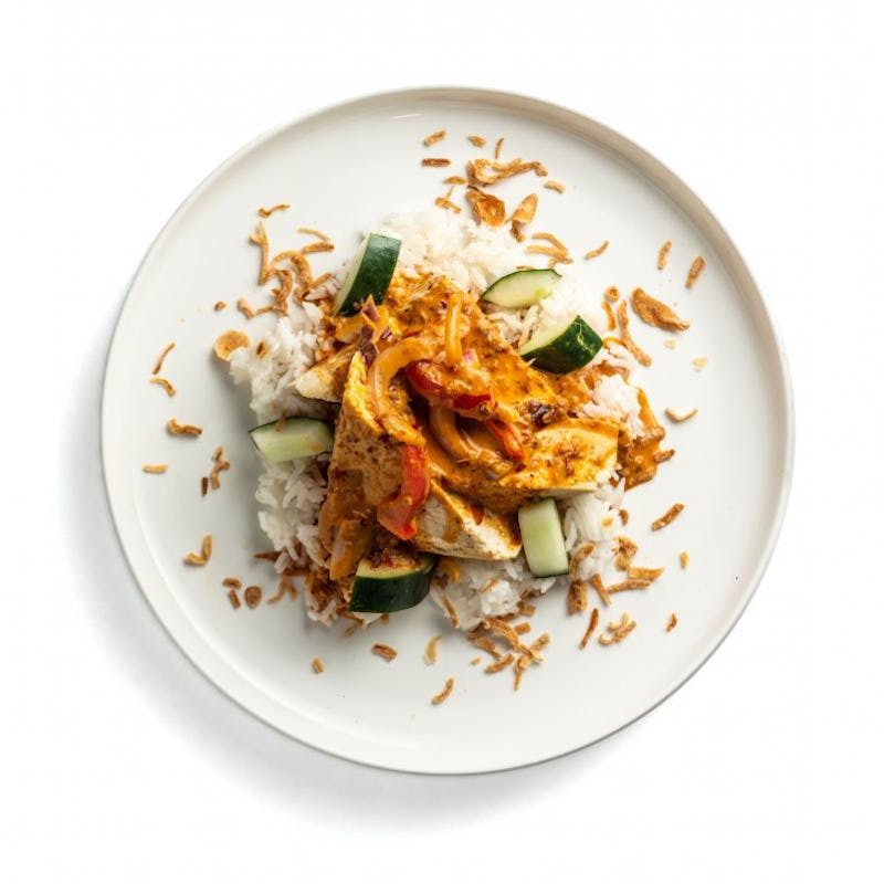 Spice Blend, Crispy Fried Shallots, Red Onion, Vegetable Base, Garlic Powder, Sugar, Jasmine Rice, Kosher Salt, Cucumber, White Vinegar, Tofu, Coconut Milk, Red Bell Pepper