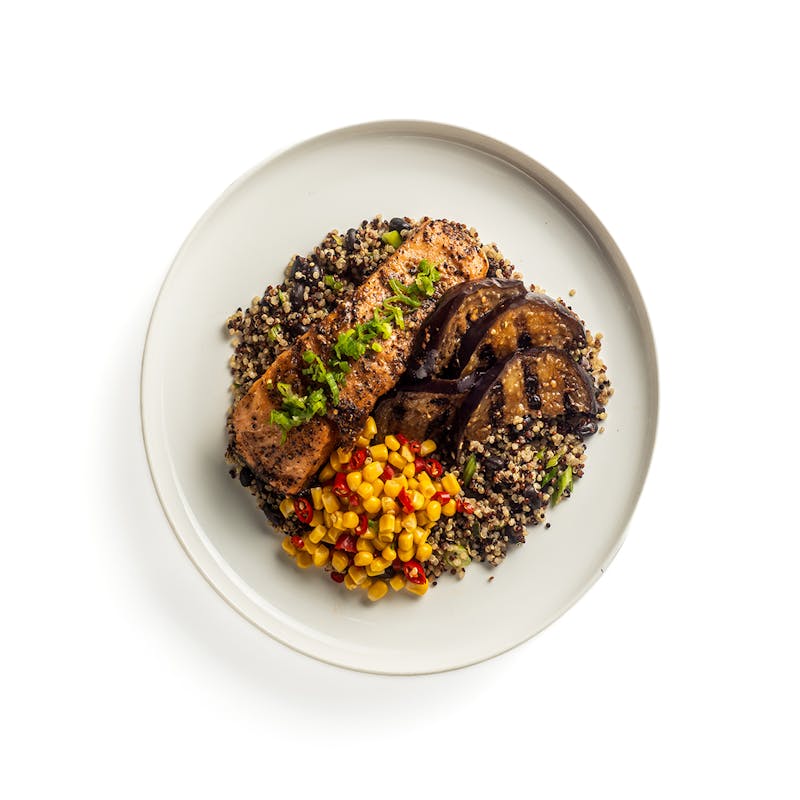 Jerk Seasoning, Canola and Olive Oil Blend, Butter, Canned Black Beans, Red Onion, Canned Corn, Cumin, Garlic Powder, Black Pepper, Cilantro, Garlic, Honey, Thai Red Peppers, Sweet Paprika, Kosher Salt, White Vinegar, Eggplant, Apple Cider Vinegar, Green Onion, Crushed Red Pepper, Quinoa, Salmon, Cayenne Powder