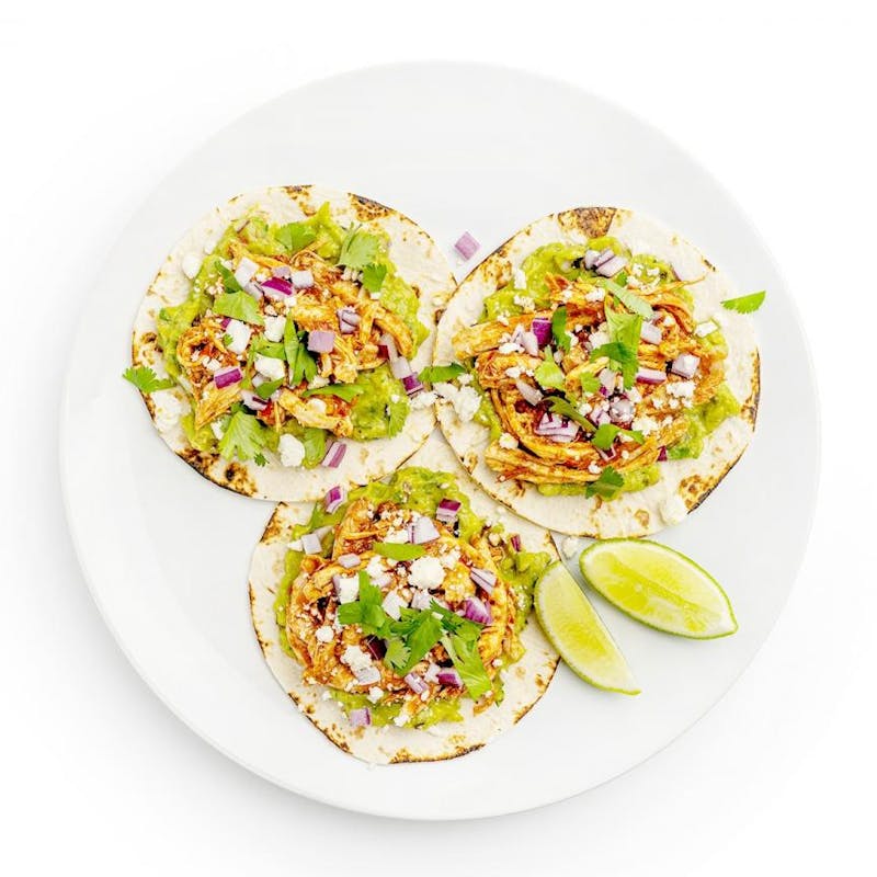 Tinga de Pollo or Chicken Tinga comes from the city of Puebla in Mexico. Chef's Fabiola's take is a pretty typical Mexican recipe made with only a few, flavor-packed ingredients like tomato, garlic, cilantro, and chipotle in adobo. The marinated chicken thighs are cooked until pull-apart tender, then plated with all the fixings to build your own tacos: soft flour tortillas, queso fresco cheese, fresh cilantro, and Chef's handmade guacamole. These satisfying, family-friendly tacos make for the perfect everyday meal!