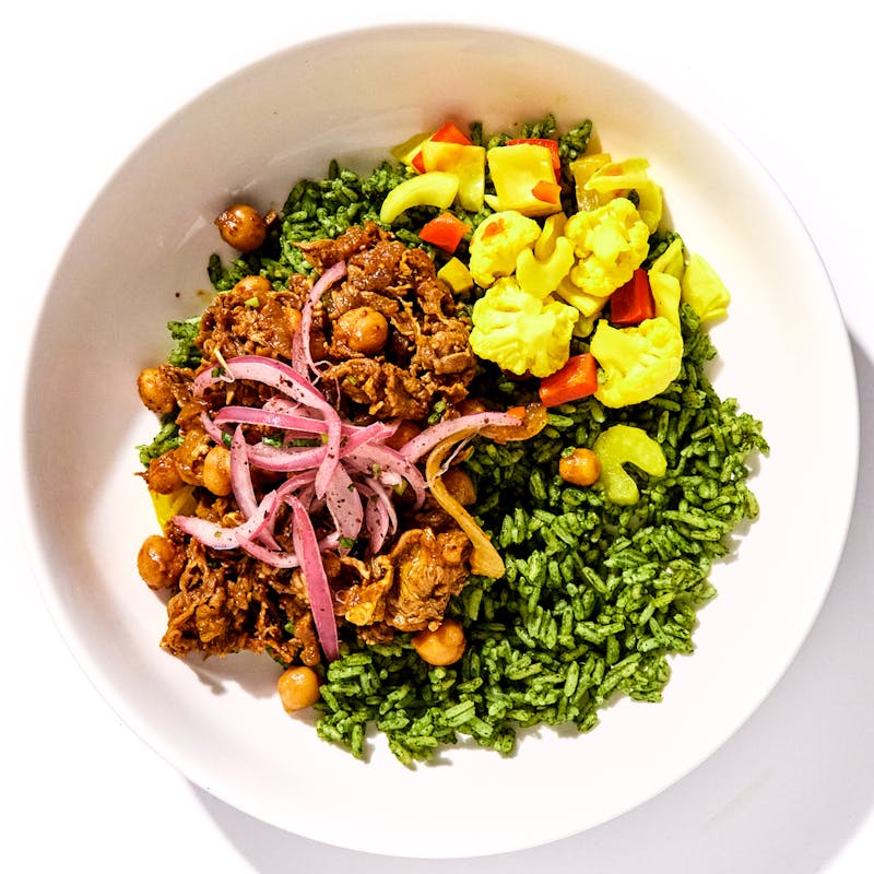 Chef Einat packs so much Middle Eastern flavor into her crave-worthy beef shawarma plate, you'll have to taste it to believe it. Juicy shawarma spice-marinated beef is braised with caramelized onions and chickpeas until super tender, then paired with green herbed sabzi rice. Accompanied by tangy pickled veggies, sumac-marinated red onions, and bright chermoula sauce, you'll savor every balanced bite of this modern Middle Eastern marvel.