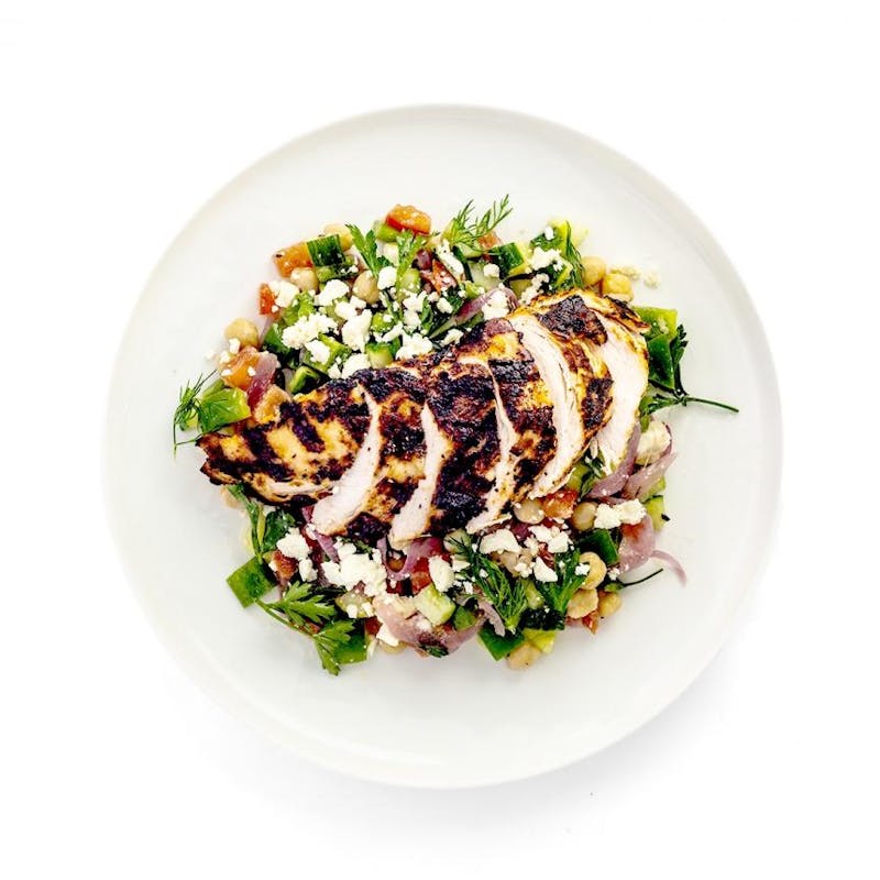 Canola and Olive Oil Blend, Extra Virgin Olive Oil, Red Onion, Plum Tomato, Red Wine Vinegar, Dill, Onion Powder, Garlic Powder, Black Pepper, Feta Cheese, Kosher Salt, Za'atar, Canned Chickpeas, Greek Yogurt, Green Bell Pepper, Chicken Breast, Canola Oil, Cucumber, Italian Parsley, Aleppo Pepper