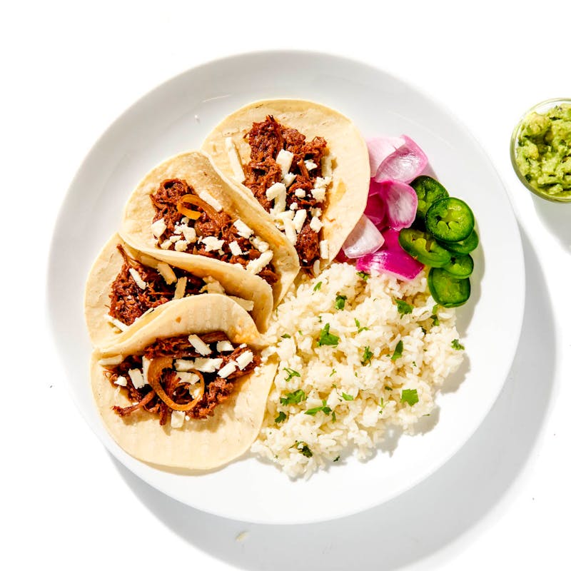 Beef Brisket, Corn Tortilla, Calrose Rice, Queso Fresco, Avocado, Jalapeno Peppers, Cilantro, Red Onion, Sour Cream, Onion, Garlic, Beef Base, Lime Juice, Butter, Kosher Salt, Taco Seasoning, Canola and Olive Oil Blend