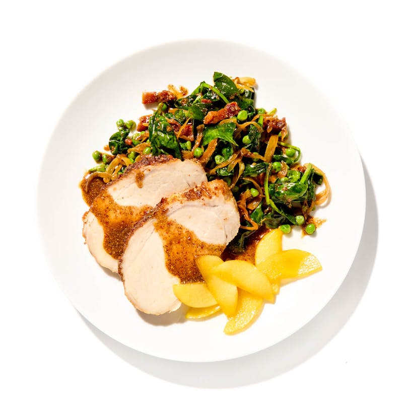 Rosemary, Coriander Seeds, Extra Virgin Olive Oil, Spinach, Honeycrisp Apple, Pork Loin, Black Pepper, Preserved Lemons, Dijon Mustard, Fennel Seed, Sugar, Onion, Peas, Kosher Salt, Shallot, Mayonnaise, Chicken Base, Granulated Garlic, Apple Cider Vinegar, Bacon, Crushed Red Pepper, Orange Zest, Apple Cider, Canola Oil, Maple Syrup
