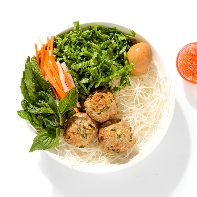 Chef Ding's take on the Vietnamese classic is a vibrant mix of flavors and textures. Savory grilled pork meatballs meet springy rice noodles, fresh herbs, and tangy pickled vegetables, all brought together by a bright lime nuoc cham that begs you to mix it all up.