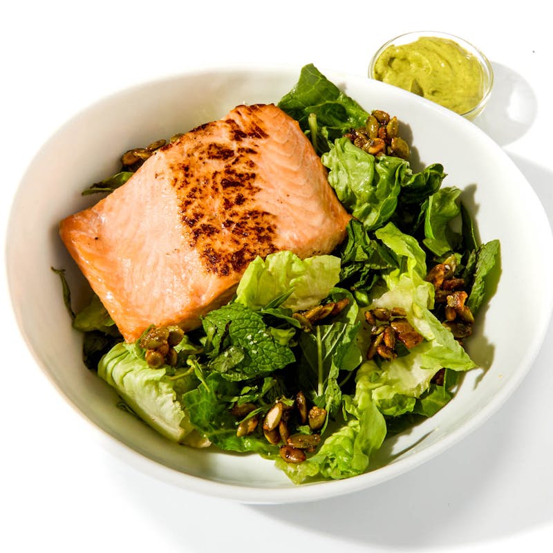 Extra Virgin Olive Oil, Mint, Dill, Pumpkin Seeds, Lemon Zest, Sugar, Kosher Salt, Shallot, Little Gem Lettuce, Tarragon, Avocado, Salmon, Champagne Vinegar