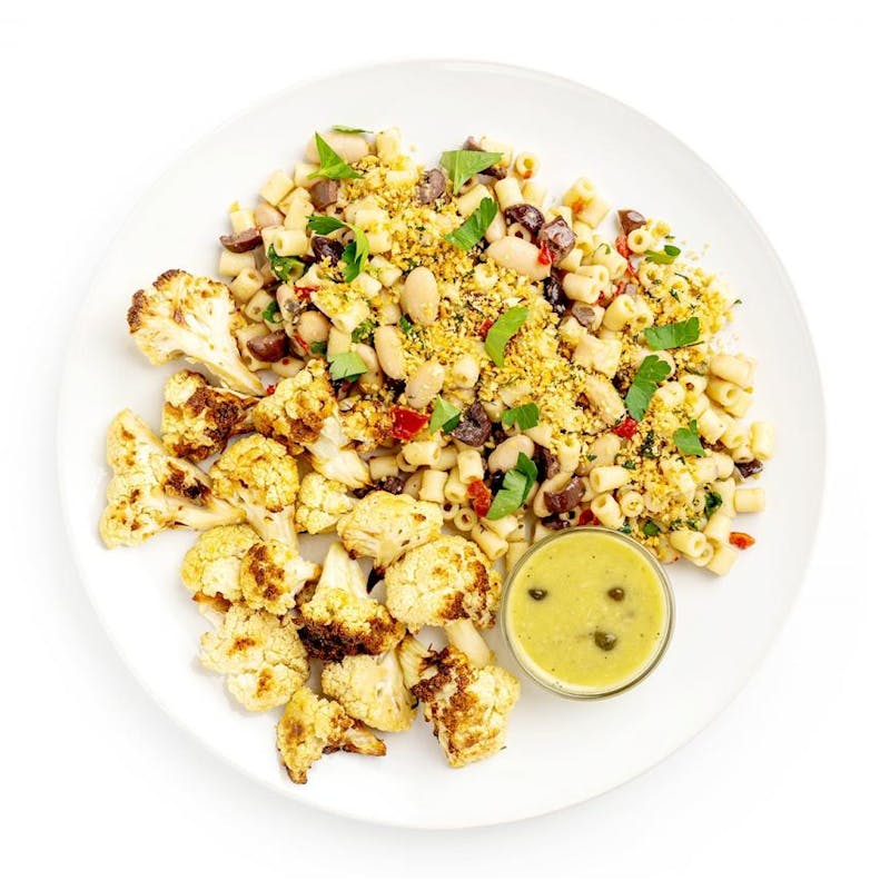 Italian inspired pasta tossed with Kalamata olives, cannellini beans, calabrian chili, olive oil, parsley and garlic, with a generous portion of char roasted cauliflower and a lemon caper olive oil sauce and seasoned bread crumbs.