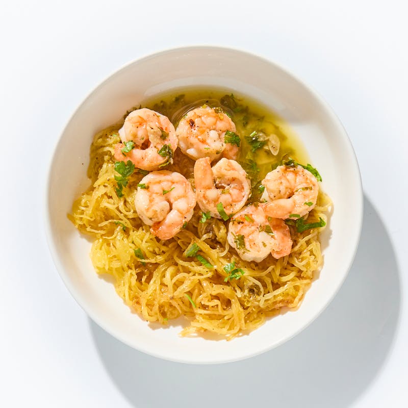 A low-carb take on the Italian-American favorite, this scampi swaps pasta for tender strands of roasted spaghetti squash. The shrimp are marinated, oven-roasted, and finished with garlic and lemon zest. A buttery white wine sauce brings the richness, while fresh parsley brightens every bite.