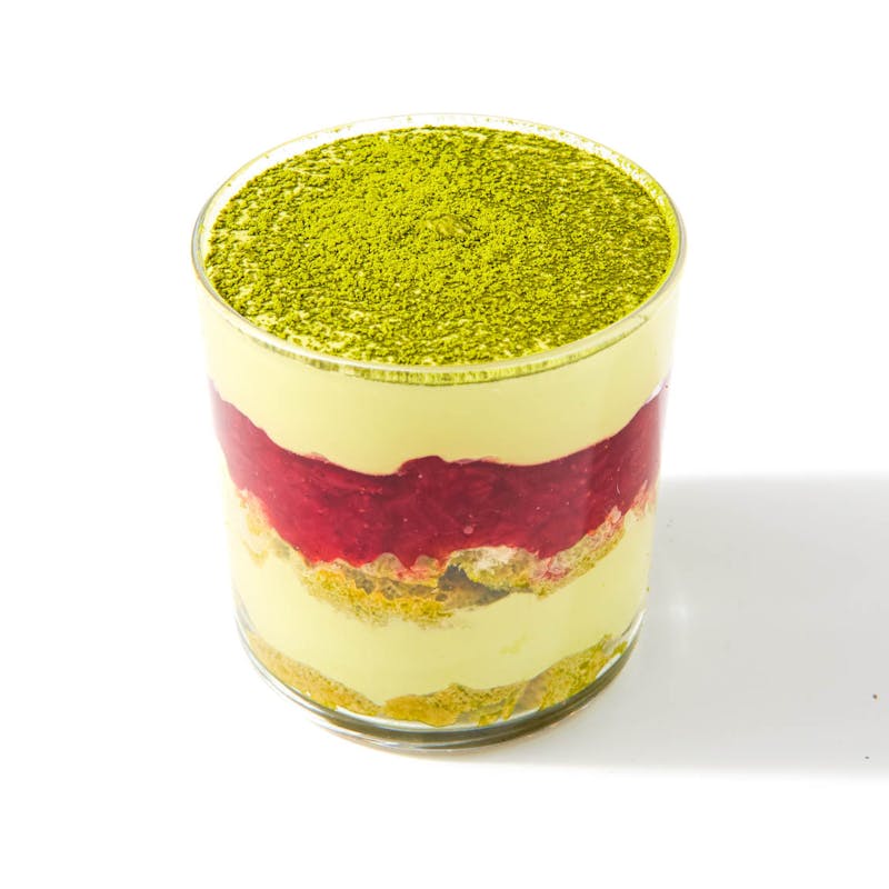 This tea-ramisu is a softer, greener take on the classic coffee-laced dessert. Delicate ladyfingers soak up sweetened green tea before they’re layered with whisked mascarpone, infused with earthy matcha and a hint of vanilla. A generous swirl of strawberry coulis brings a fruity finish to every creamy spoonful.