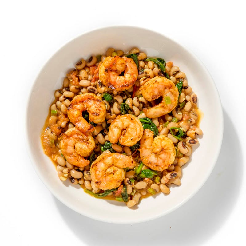Plump shrimps hit the grill dusted in suya spice—a West African blend of ginger, cumin, and paprika. Chef Pierre then serves them on a stew of slow-cooked black-eyed peas, spinach, and tomatoes, rich with curry powder and garlic.