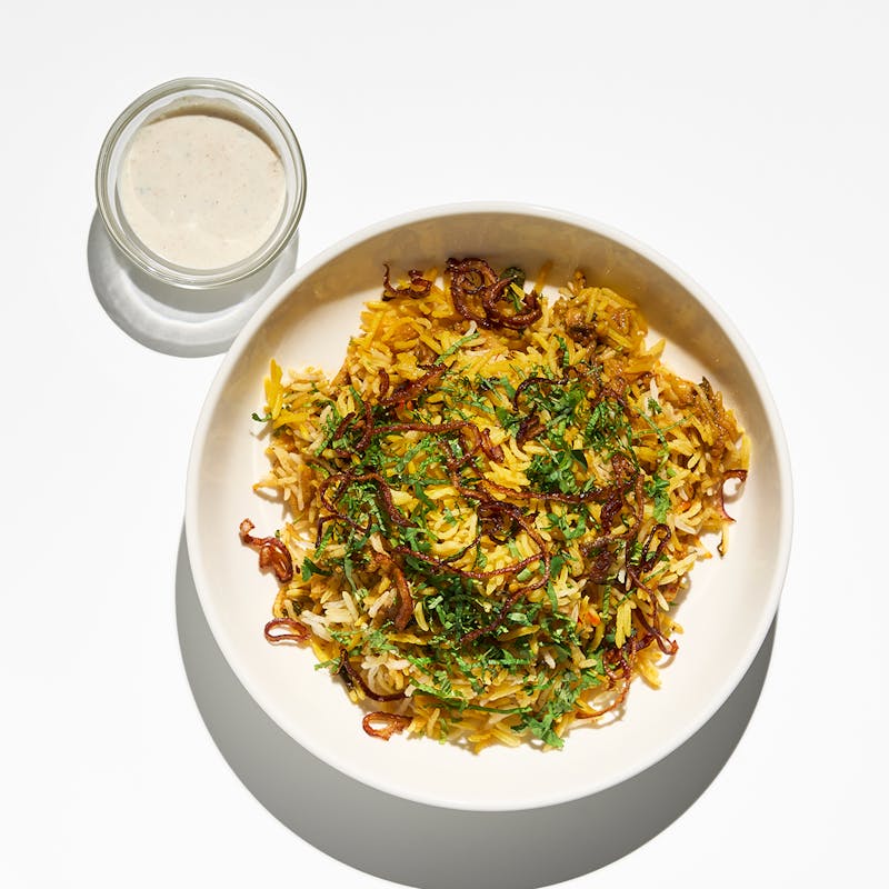 Traditional Hyderabadi Biryani is a layered dish of basmati rice, marinated chicken, and spices and aromatics, all cooked in a sealed pot over low heat. Chef Raj's version has all those layers of complex, comforting flavor and gets garnished with fried onions, fresh cilantro, and mint. This dish is best served drizzled with raita, a refreshing cucumber-yogurt sauce which helps cool the palate and balance out the spice.