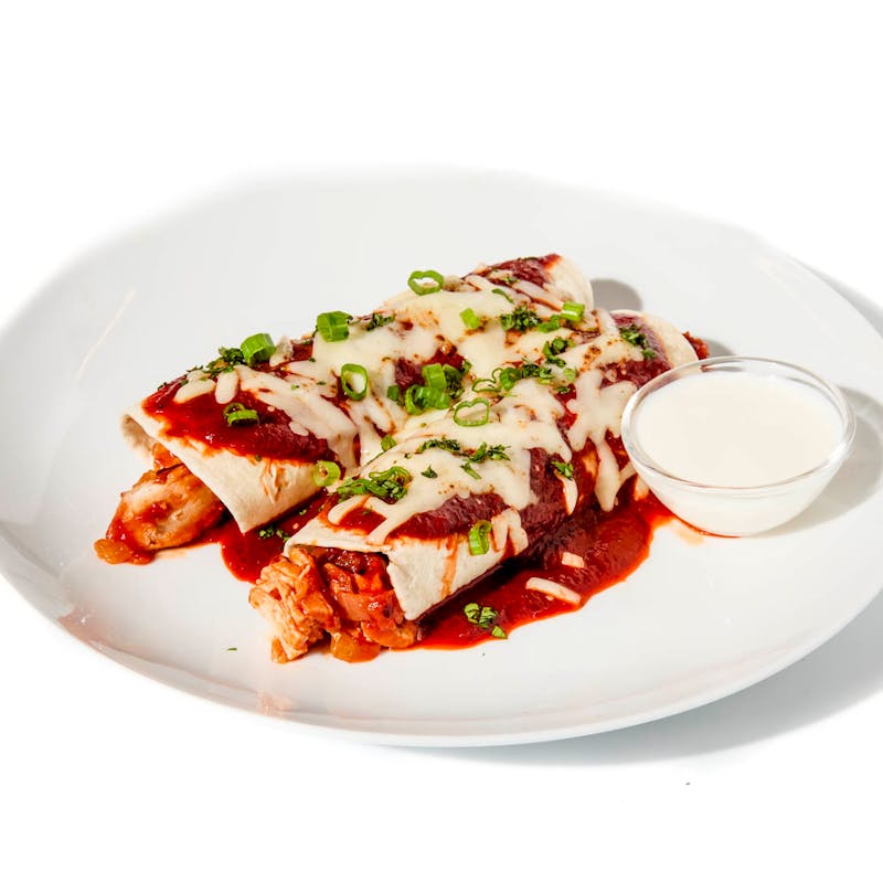 These enchiladas are rolled with roasted pulled chicken, creamy Chihuahua cheese, and Mexican crema, all wrapped in soft corn tortillas. They’re smothered in a smoky guajillo chile sauce, then topped with fresh cilantro and green onions.