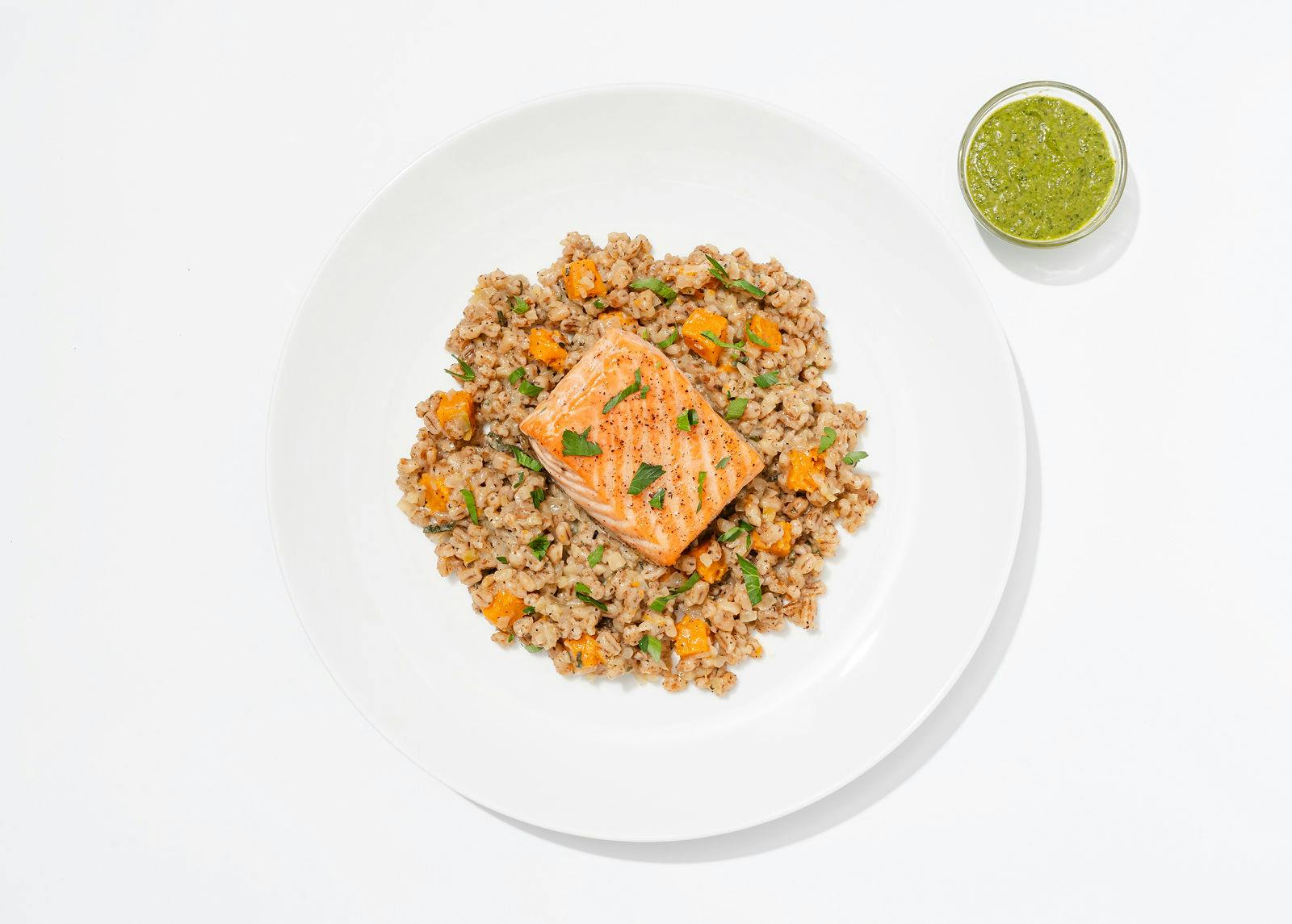 *NOTE: Nutritional Values are calculated assuming full consumption of all included condiments or dressings, which may make up a significant percentage of the values below. Chef Toben’s love for deli counter classics takes a lighter, modern turn in this crave-able dish. Salmon is coated in a toasty “everything” spice mix—garlic, onion, seeds, the works—then brushed with a tangy-sweet honey mustard glaze that caramelizes into the fish. Beneath it sits hearty farroto—nutty grains cooked risotto-style, slow-simmered with aromatics. Meaty mushrooms, sweet leeks, and earthy celeriac give it depth and richness, without the weight.