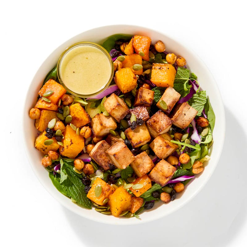 Enjoy a wholesome and vibrant bowl featuring maple-roasted butternut squash, crispy chickpeas, and golden tofu served over a fresh mix of shredded kale, quinoa, Brussels sprouts, and currants. Finished with a light maple dressing, this salad bowl balances sweet, savory, and crunchy textures for a nourishing, protein-packed meal.
