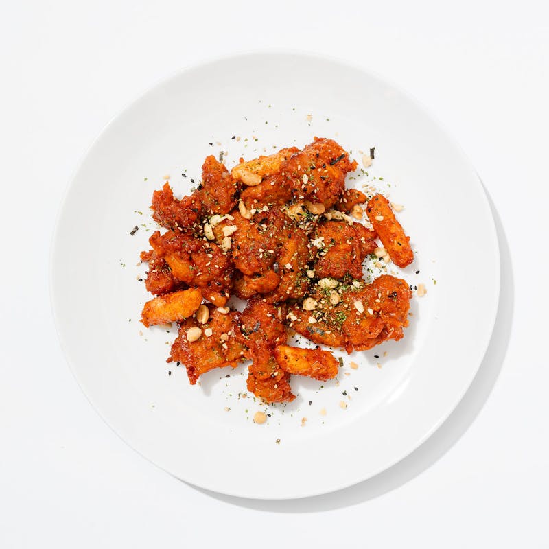 Chef Kate brings us the ultimate Korean comfort snack. Golden-fried chicken thighs get tossed in a sticky-sweet gochujang glaze alongside chewy rice cakes. Glossy and gently fiery, they’re scattered with peanuts and sesame seeds, bringing a crunchy, nutty finish.