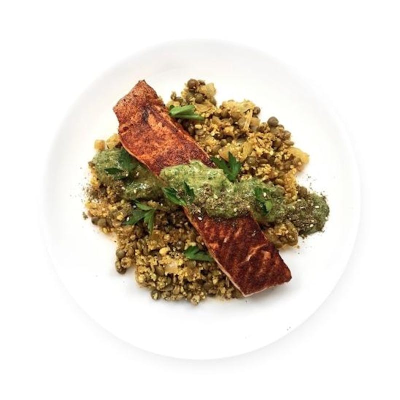 Salmon, Cauliflower, Red Onion, Lemon, Brown Lentils, Cilantro, Italian Parsley, Baharat, Canola and Olive Oil Blend, Extra Virgin Olive Oil, Lemon Juice, Sherry Vinegar, Kosher Salt, Black Pepper, Jalapeno Peppers, Garlic, Cumin, Crushed Red Pepper, Sumac, Oregano
