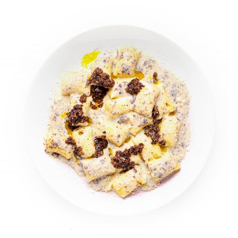 Asiago Gnocchi, Truffle Paste, Pecorino Cheese, All Purpose Flour, Butter, Heavy Cream, Onion, Kosher Salt, Black Pepper, Whole Milk, Parmesan Cheese