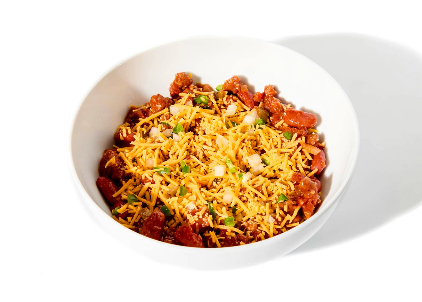 Slow-simmered ground beef chili—thick with crushed tomatoes and red kidney beans—gets topped with sharp cheddar, a scatter of onions, and just enough jalapeño to wake things up.