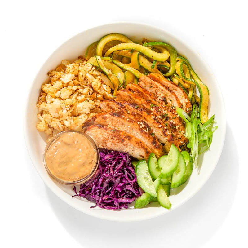 Pad Thai is an icon for a reason, beloved for its colorful fusion of sweet and savory flavors. This keto-friendly take pays homage to the classic while trading in traditional noodles for spiralized zucchini and cauliflower rice. They’re tossed with colorful veggies and topped with a grilled chicken thigh rubbed in warming spices. A silky peanut sauce, laced with coconut and honey, is served on the side. Low in carbs and high in protein, it’s a fresh, nourishing twist on a takeout favorite.